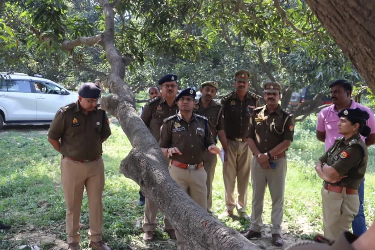 घटना स्थल पर पुलिस कर्मियों से जानकारी करते डीईजी व एसपी