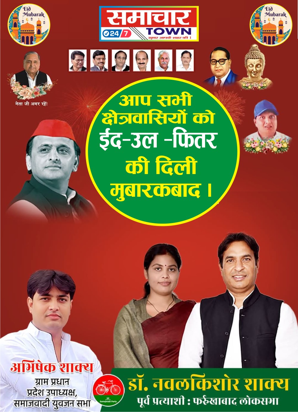 डॉ. नवल किशोर शाक्य पूर्व प्रत्याशी फर्रुखाबाद लोकसभा व अभिषेक शाक्य ग्राम प्रधान, प्रदेश उपाध्यक्ष समाजवादी युवजन सभा की ओर से आप सभी नगर व क्षेत्रवासियों को ईद-उल-फितर की दिली मुबारकबाद।