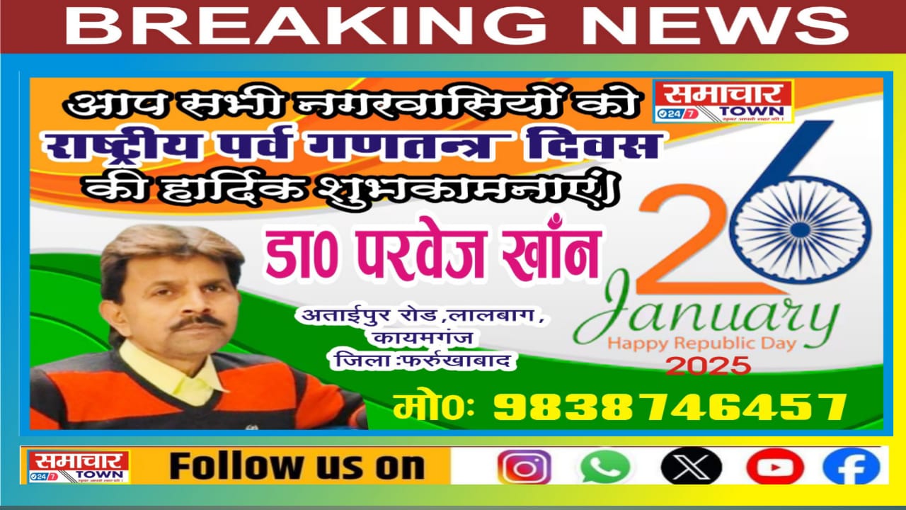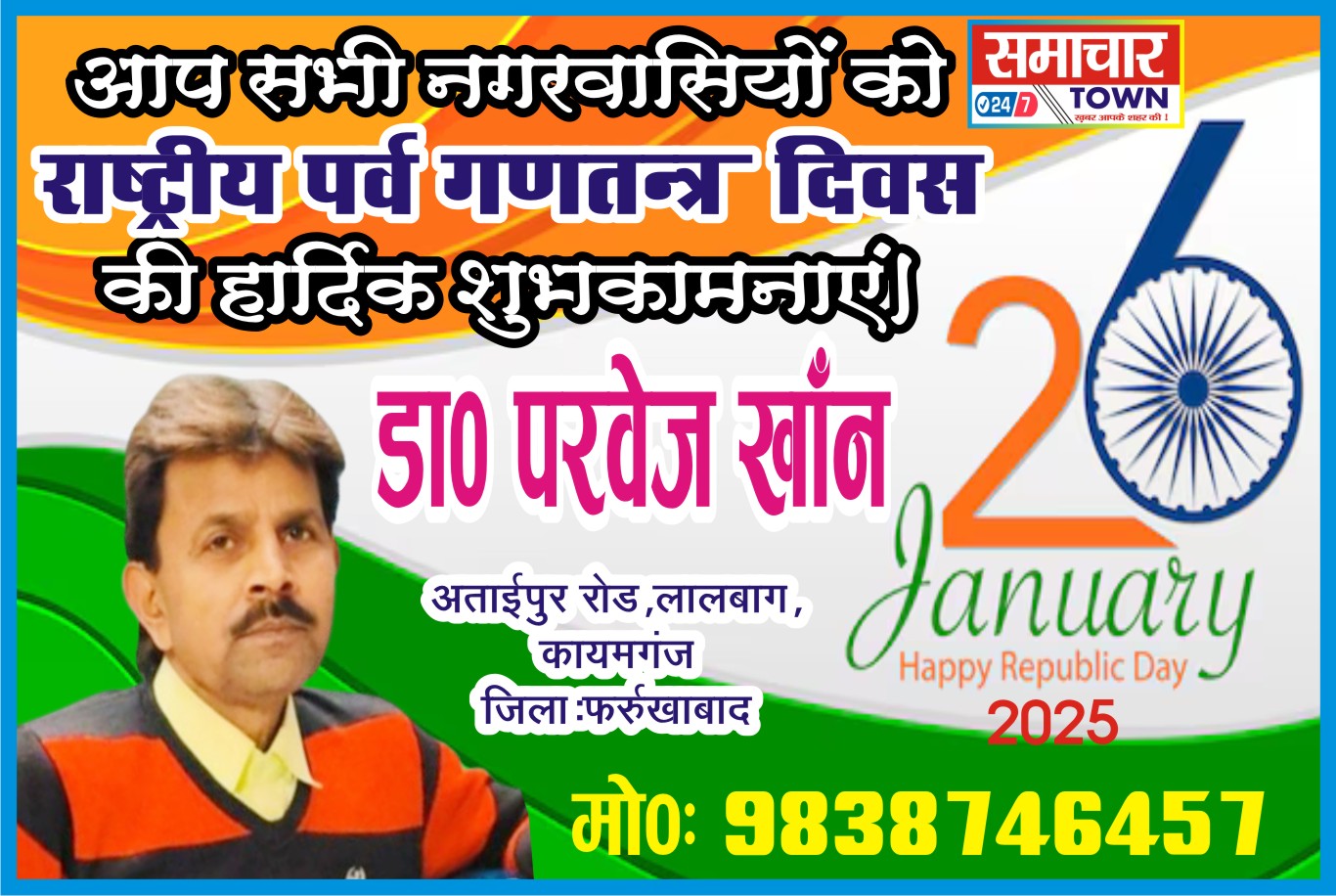Farrukhabad:- डॉ. परवेज खान की ओर से सभी क्षेत्रवासियों को गणतंत्र दिवस की हार्दिक शुभकामनाएं। Post navigation Farrukhabad: सलमान खां उर्फ छाम खां व सुभान खां की ओर से सभी क्षेत्रवासियों को गणतंत्र दिवस की हार्दिक शुभकामनाएं।Farrukhabad: सी.पी. विघा निकेतन की ओर से सभी क्षेत्रवासियों को गणतंत्र दिवस की हार्दिक शुभकामनाएं।