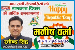 Farrukhabad:- मनीष वर्मा नायब तहसीलदार की ओर से सभी क्षेत्रवासियों को गणतंत्र दिवस की हार्दिक शुभकामनाएं। Post navigation Farrukhabad: सुधांशु अग्निहोत्री लेखपाल की ओर से सभी क्षेत्रवासियों को गणतंत्र दिवस की हार्दिक शुभकामनाएं।Farrukhabad: सृजन कुमार नायब तहसीलदार की ओर से सभी क्षेत्रवासियों को गणतंत्र दिवस की हार्दिक शुभकामनाएं।