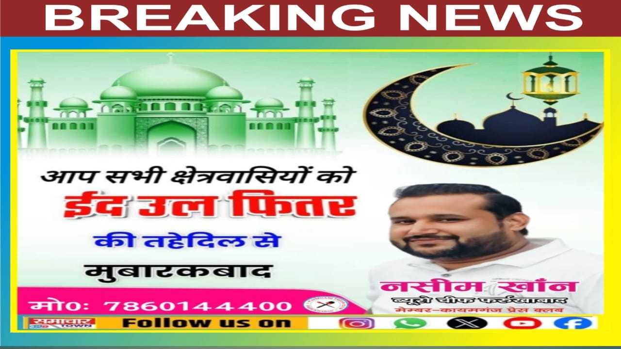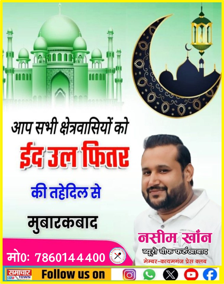 Farrukhabad: नसीम खाँन ब्यूरो चीफ फर्रुखाबाद समाचार टाउन की ओर से आप सभी नगर व क्षेत्रवासियों को ईद-उल-फितर की दिली मुबारकबाद।