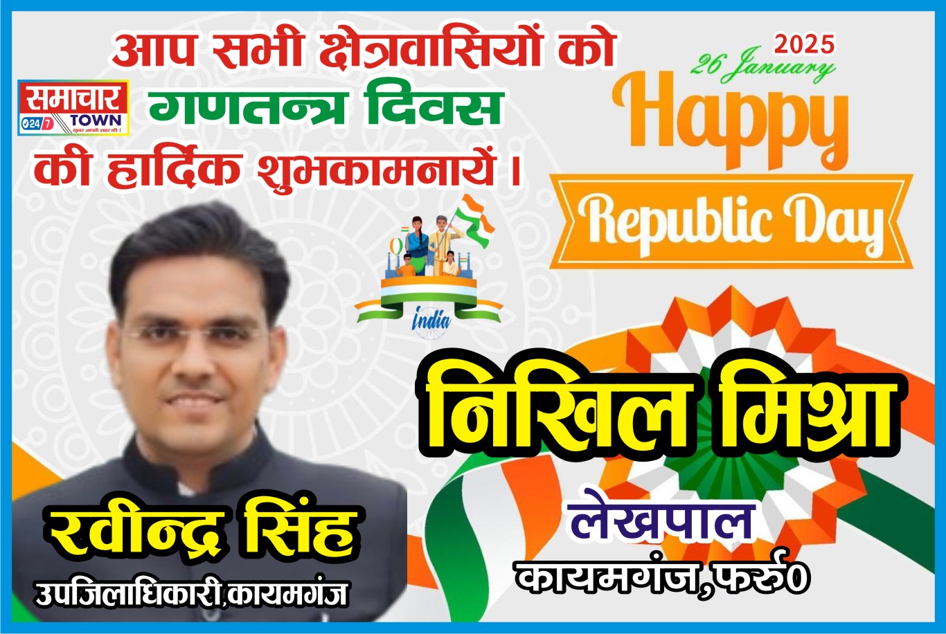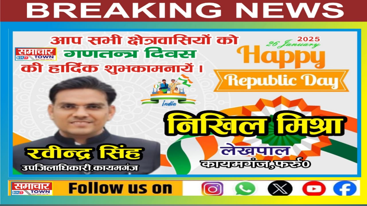Farrukhabad:- निखिल मिश्रा लेखपाल की ओर से सभी क्षेत्रवासियों को गणतंत्र दिवस की हार्दिक शुभकामनाएं। Post navigation Farrukhabad: सृजन कुमार नायब तहसीलदार की ओर से सभी क्षेत्रवासियों को गणतंत्र दिवस की हार्दिक शुभकामनाएं।Farrukhabad: आकाश भदौरिया तहसील मंत्री लेखपाल संघ की ओर से सभी क्षेत्रवासियों को गणतंत्र दिवस की हार्दिक शुभकामनाएं।