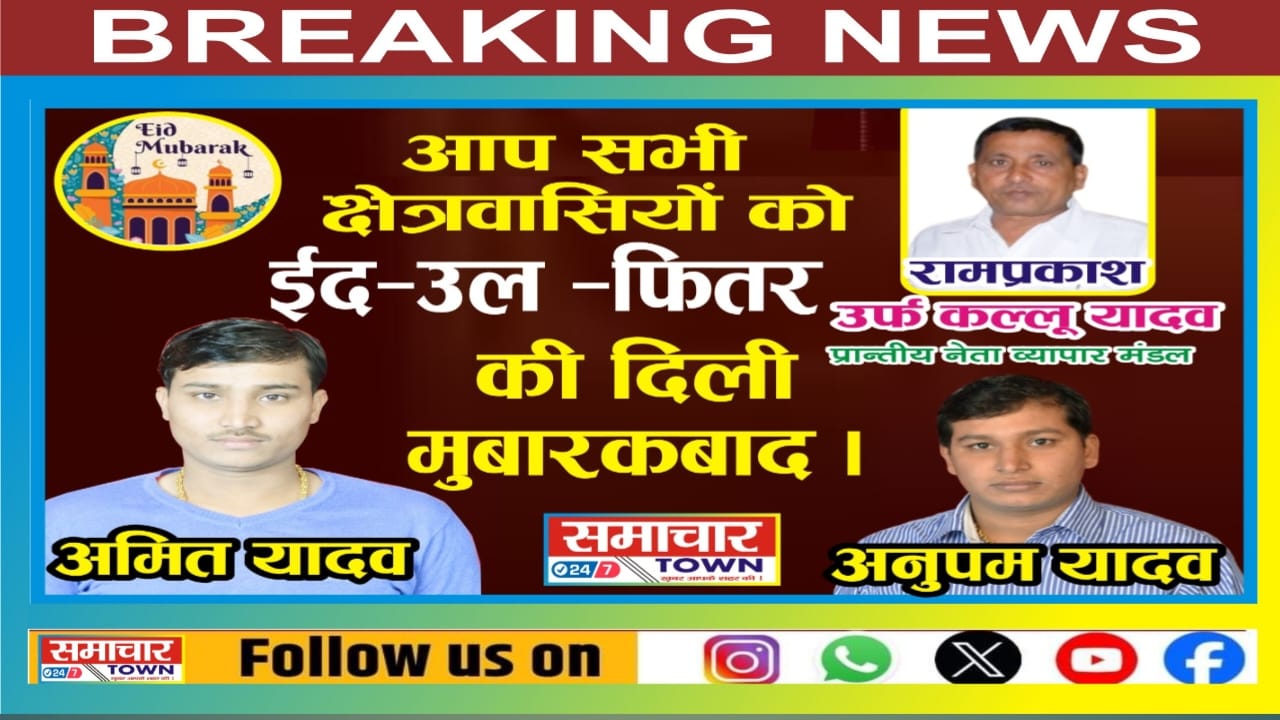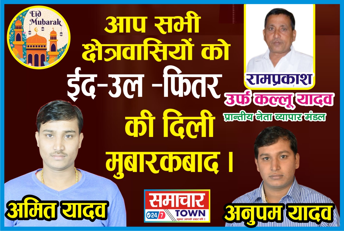 रामप्रकाश उर्फ कल्लू यादव प्रान्तीय नेता व्यापार मण्डल, अमित यादव व अनुपम यादव की ओर से आप सभी नगर व क्षेत्रवासियों को ईद-उल-फितर की दिली मुबारकबाद।