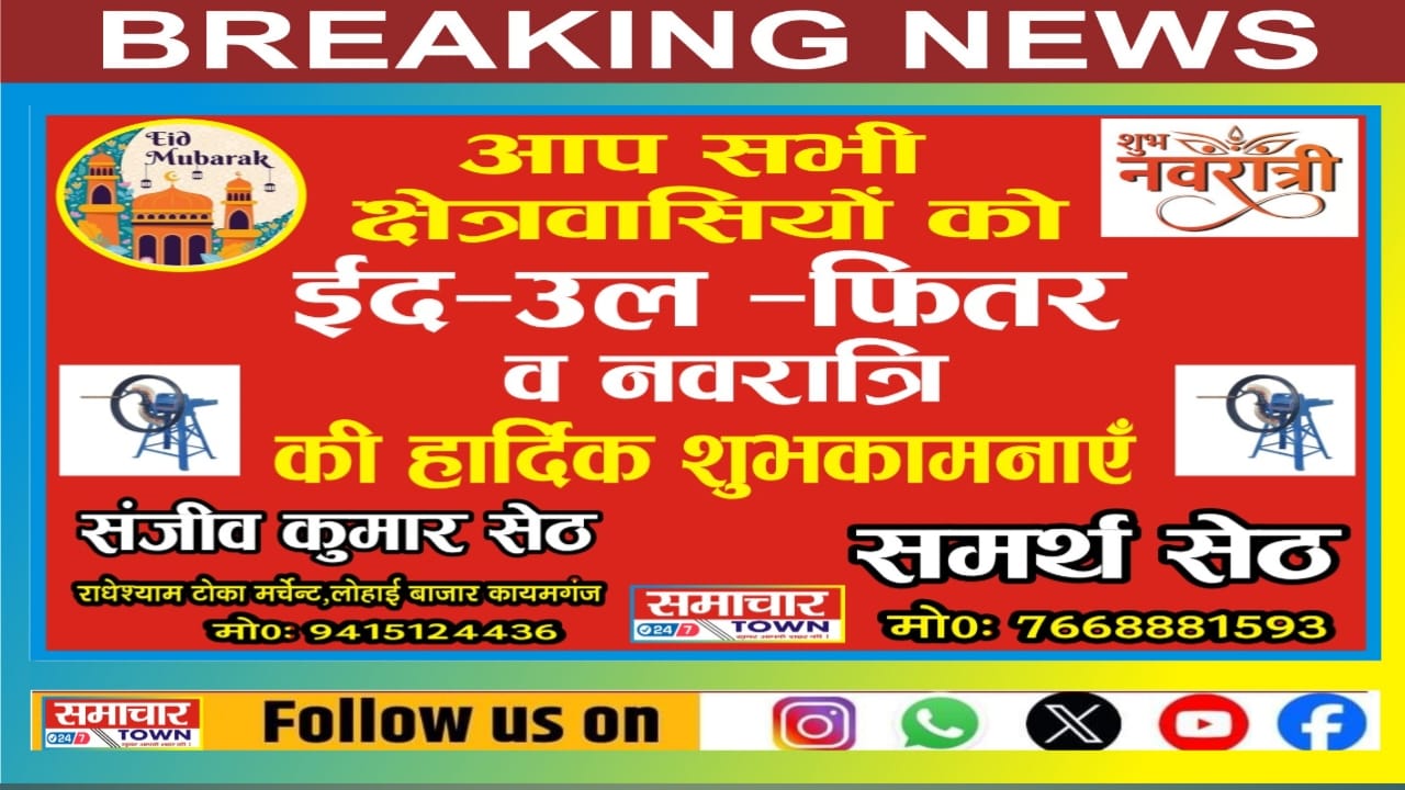Farrukhabad: संजीव कुमार सेठ राधेश्याम टोका मर्चेन्ट, लोहाई बाजार कायमगंज,समर्थ सेठ की ओर से आप सभी नगर व क्षेत्रवासियों को ईद-उल-फितर व नवरात्रि की हार्दिक शुभकामनाएं।
