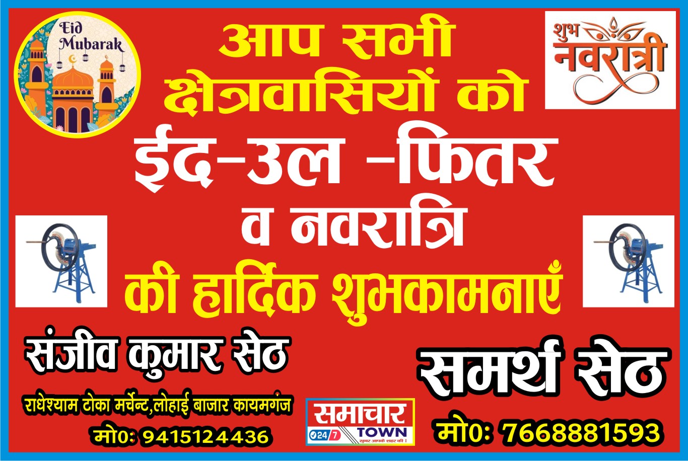 संजीव कुमार सेठ राधेश्याम टोका मर्चेन्ट, लोहाई बाजार कायमगंज,समर्थ सेठ की ओर से आप सभी नगर व क्षेत्रवासियों को ईद-उल-फितर व नवरात्रि की हार्दिक शुभकामनाएं।