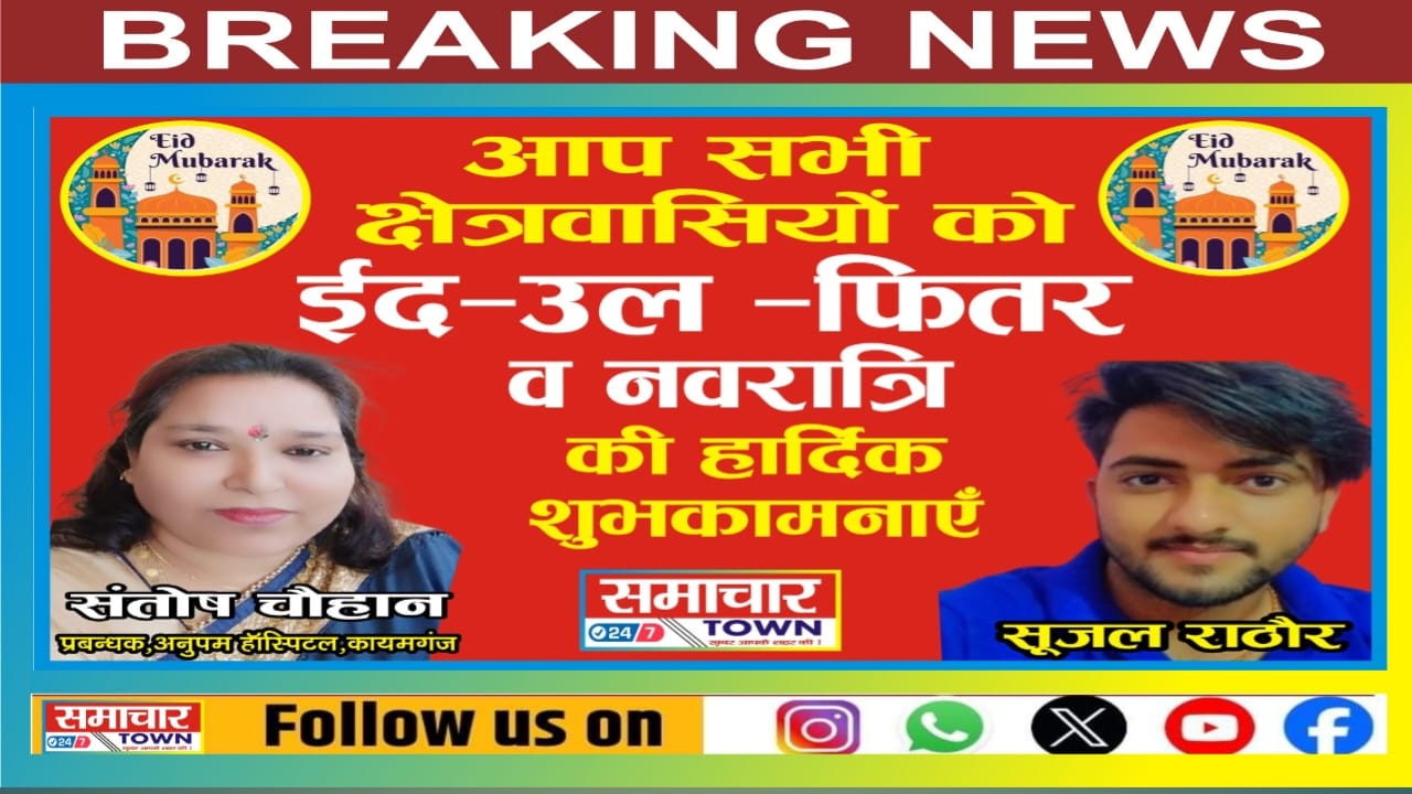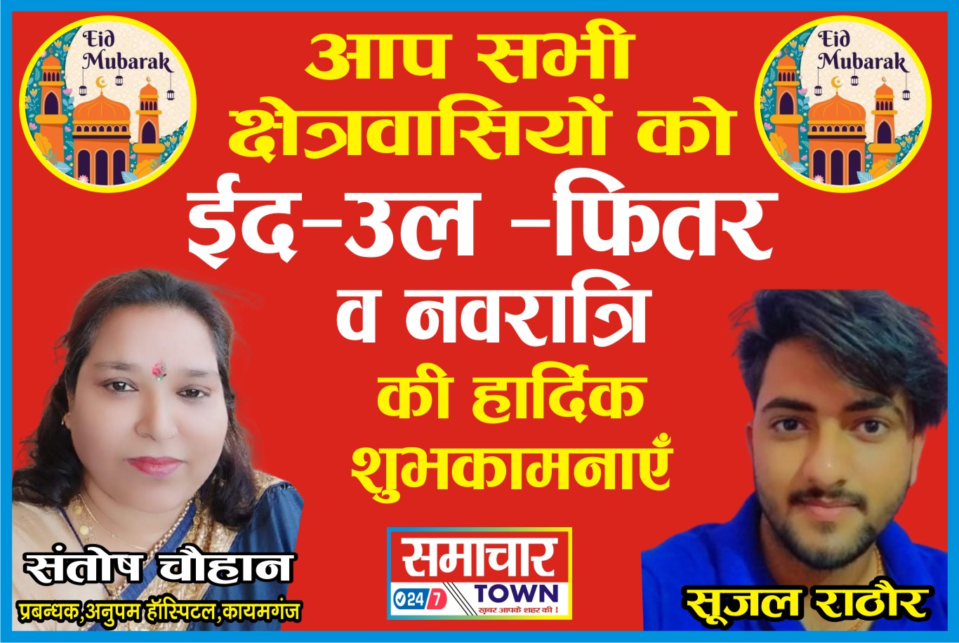 संतोष चौहान प्रबन्धक, अनुपम हॉस्पिटल, कायमगंज व सूजल राठौर की ओर से आप सभी नगर व क्षेत्रवासियों को ईद-उल-फितर की दिली मुबारकबाद।