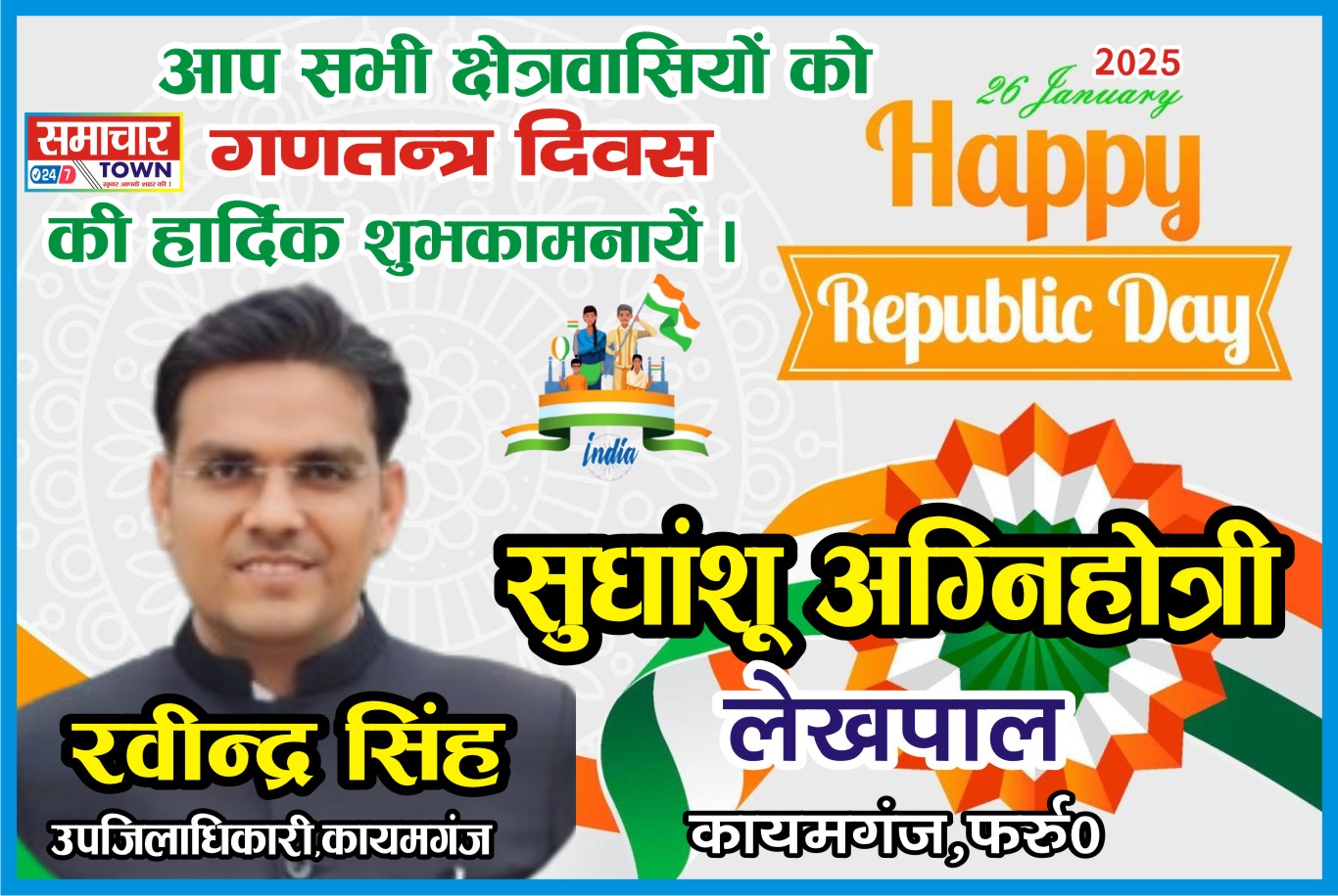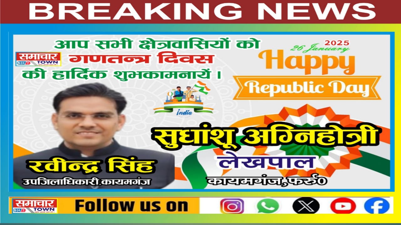 Farrukhabad:- सुधांशु अग्निहोत्री लेखपाल की ओर से सभी क्षेत्रवासियों को गणतंत्र दिवस की हार्दिक शुभकामनाएं। Post navigation Farrukhabad: प्रीतम सिंह सब रजिस्ट्रार की ओर से सभी क्षेत्रवासियों को गणतंत्र दिवस की हार्दिक शुभकामनाएं।Farrukhabad: मनीष वर्मा नायब तहसीलदार की ओर से सभी क्षेत्रवासियों को गणतंत्र दिवस की हार्दिक शुभकामनाएं।